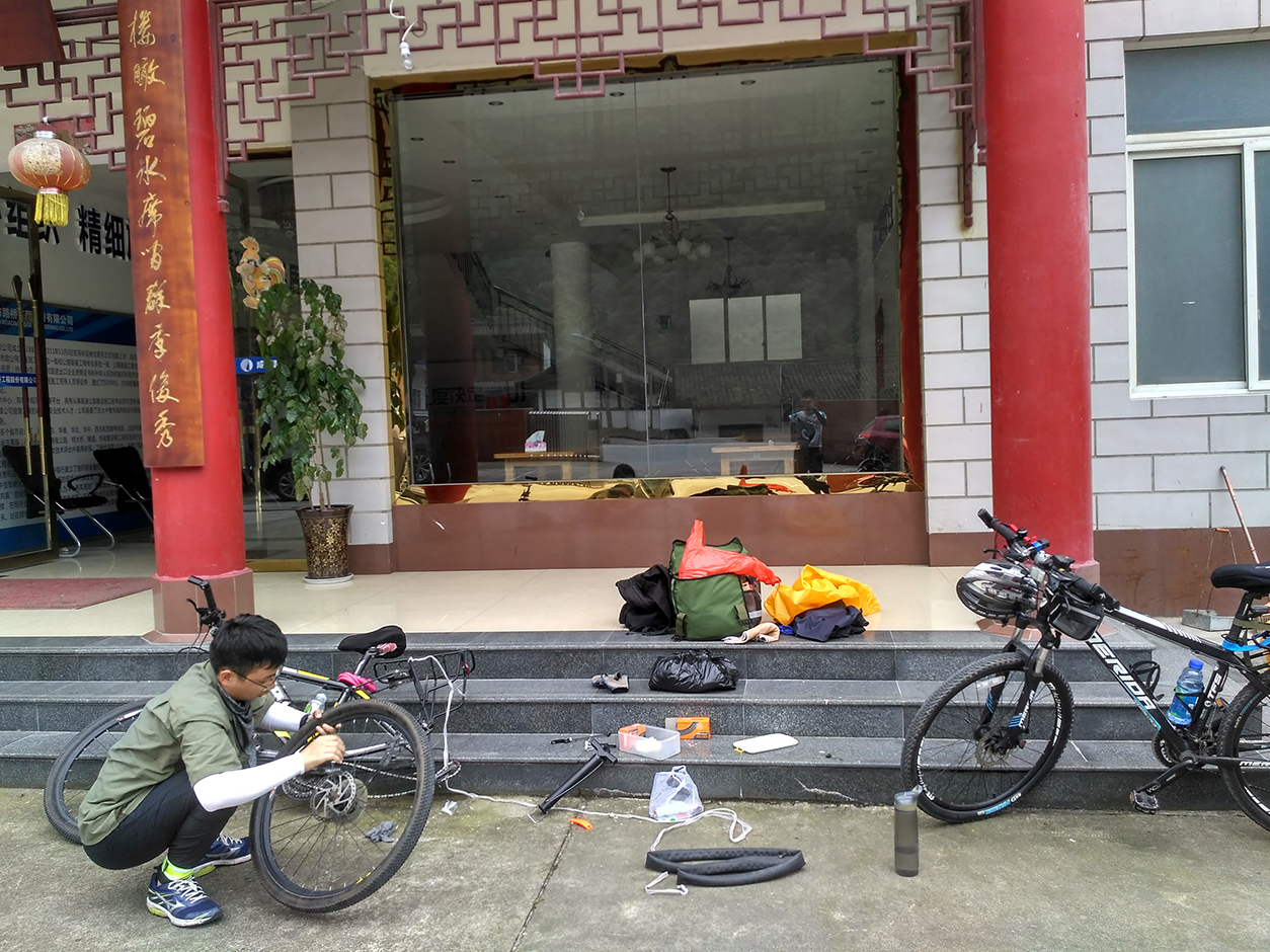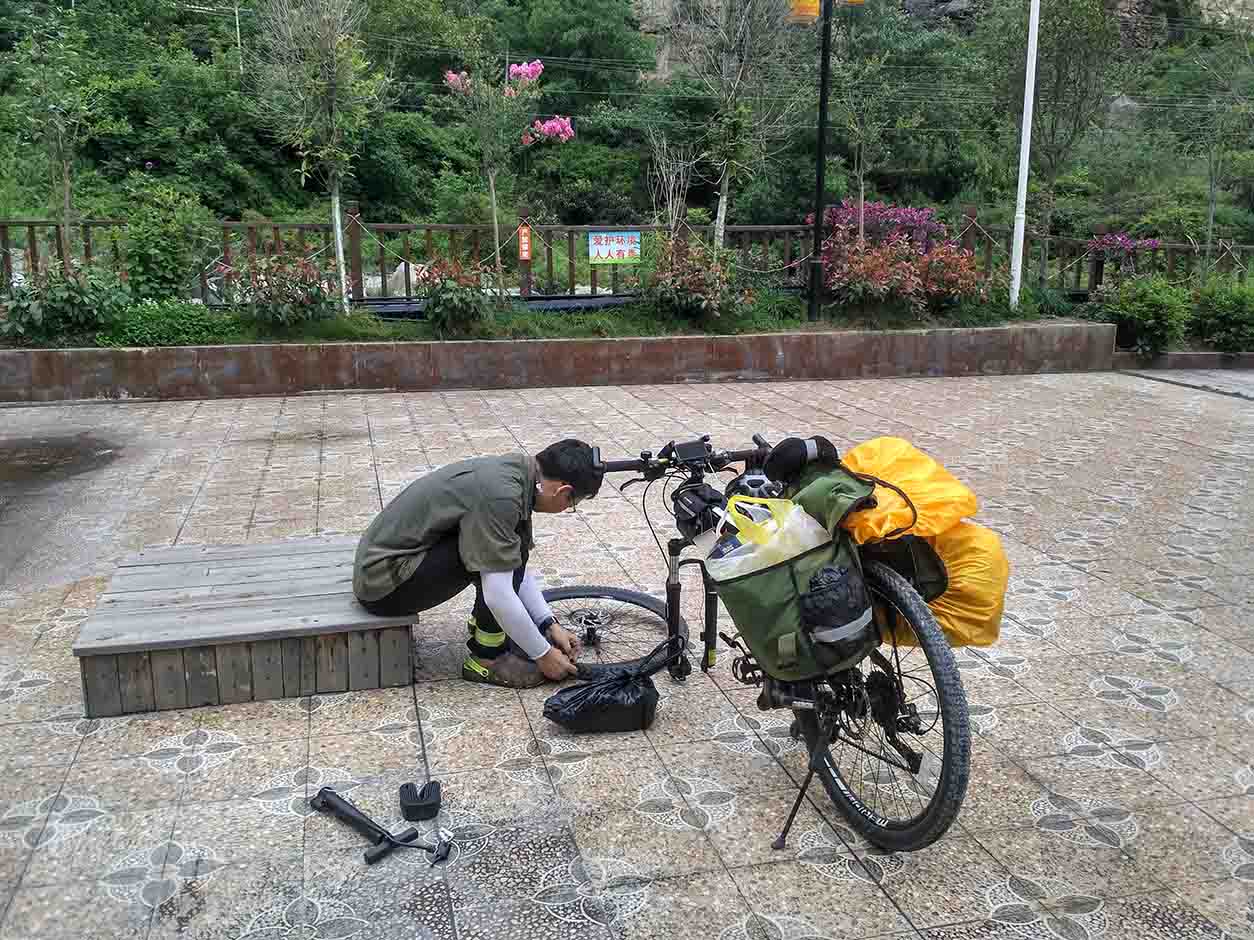 下坡快到七十二拐时,队友的车胎没气了,然后接着换轮胎。