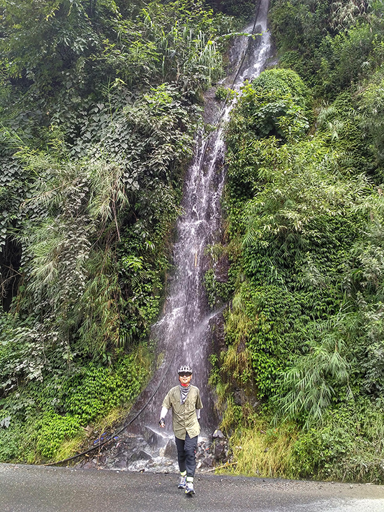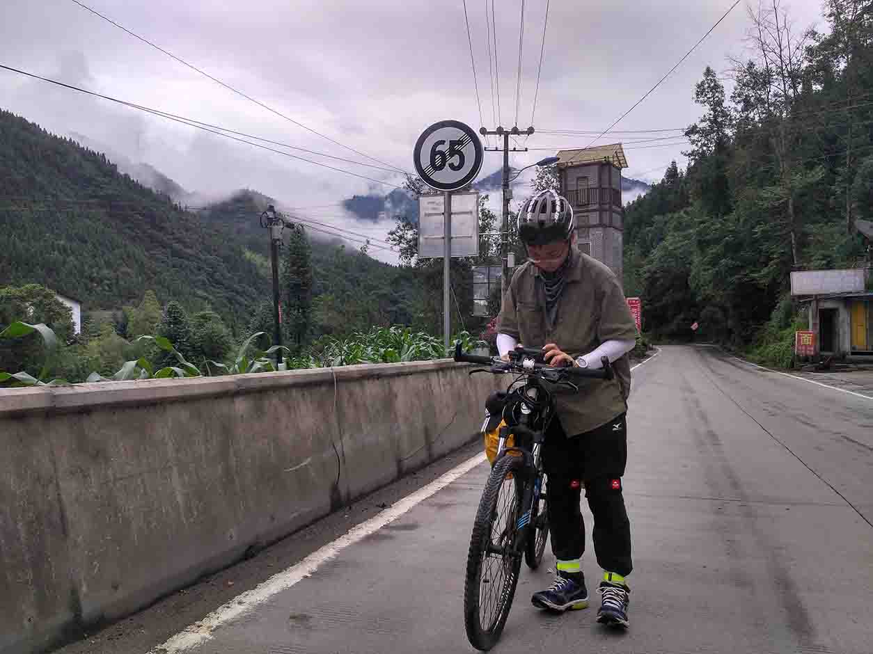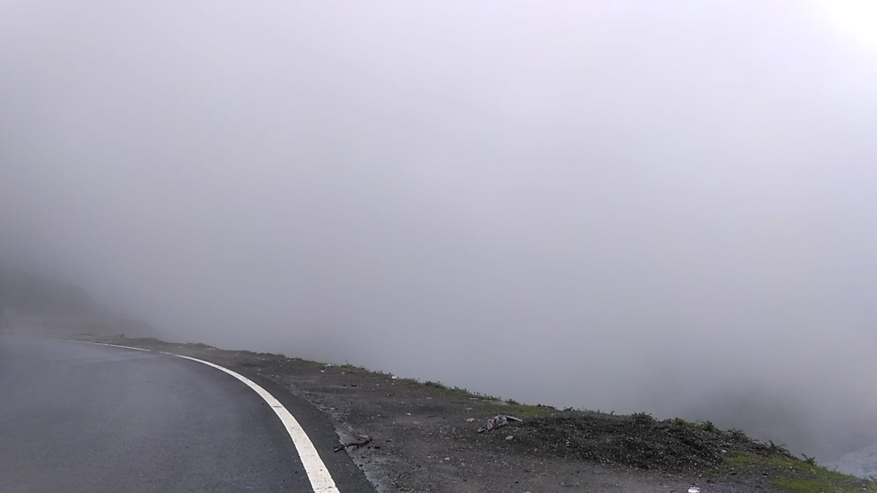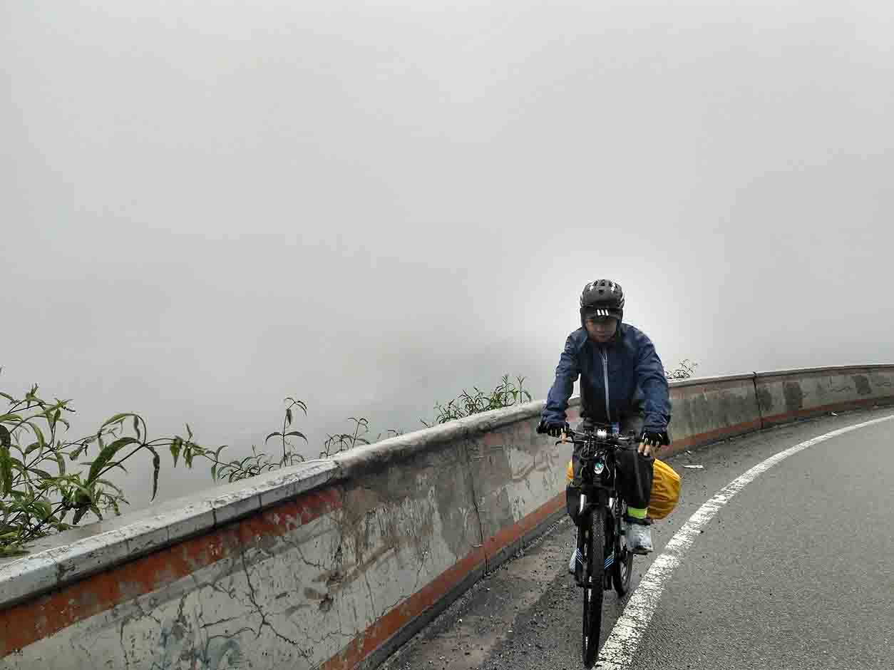 ▼天还没亮,打开手电骑了十几公里。快到山顶时,又起了大雾。