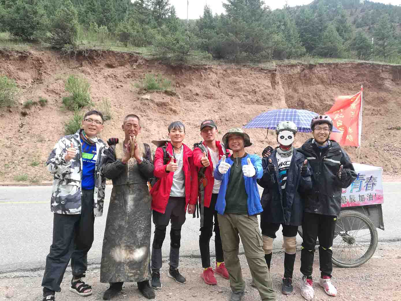 ▼还见到三个从河南推车过来的,于是我们推车的、骑行的、朝拜的一块拍了张照。
