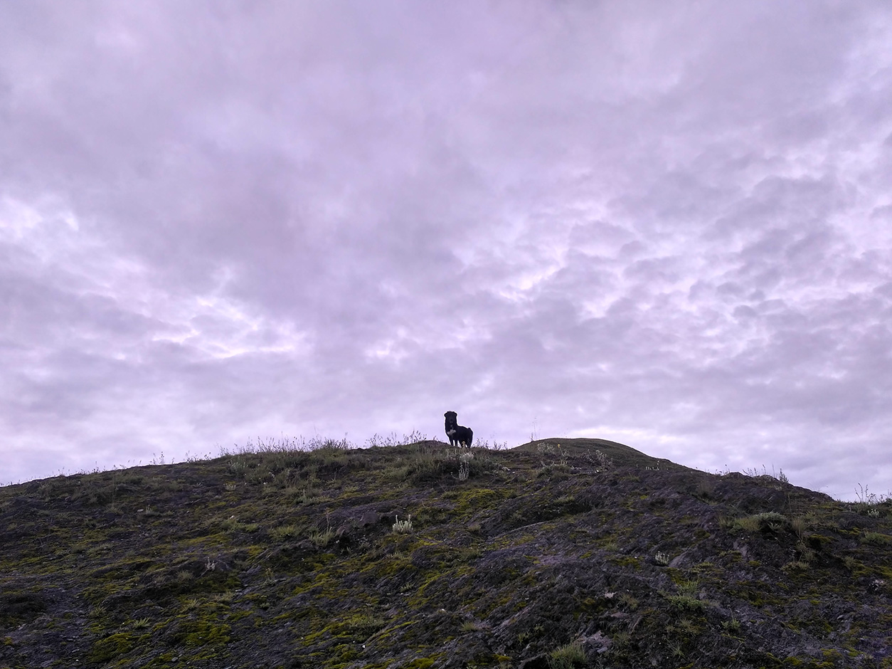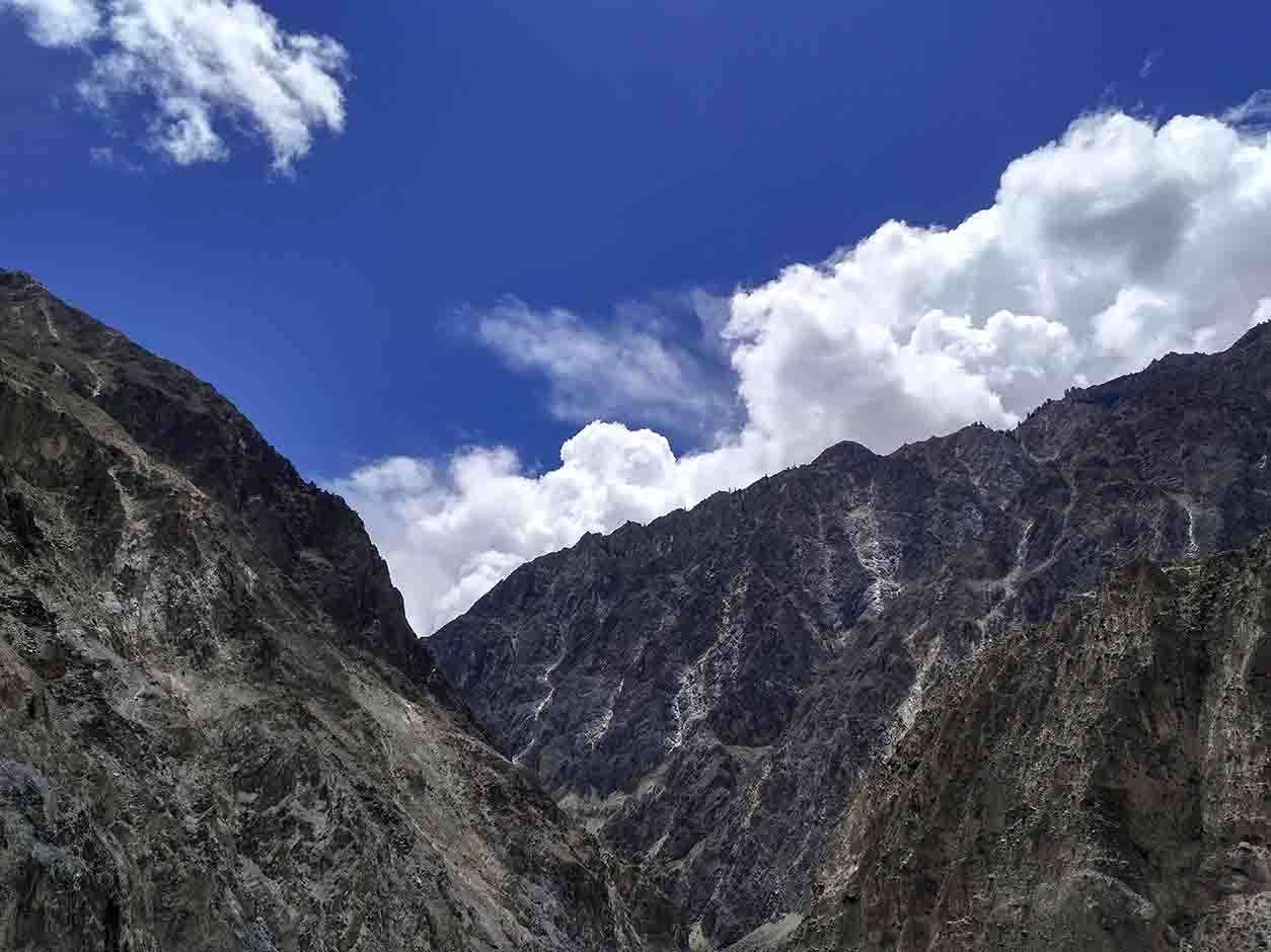 ▼山上黑色的岩石与蓝天白云形成鲜明的对比。
