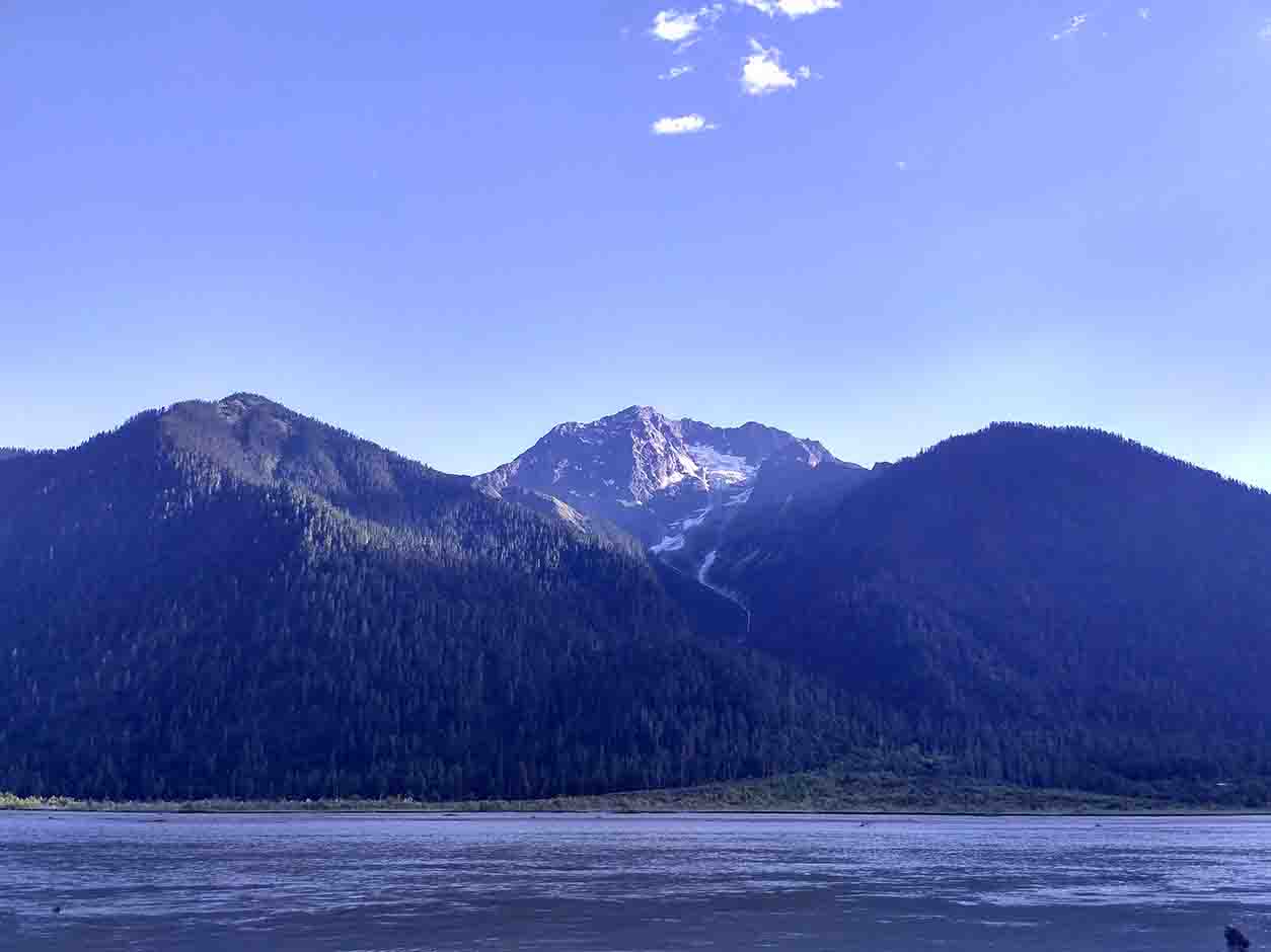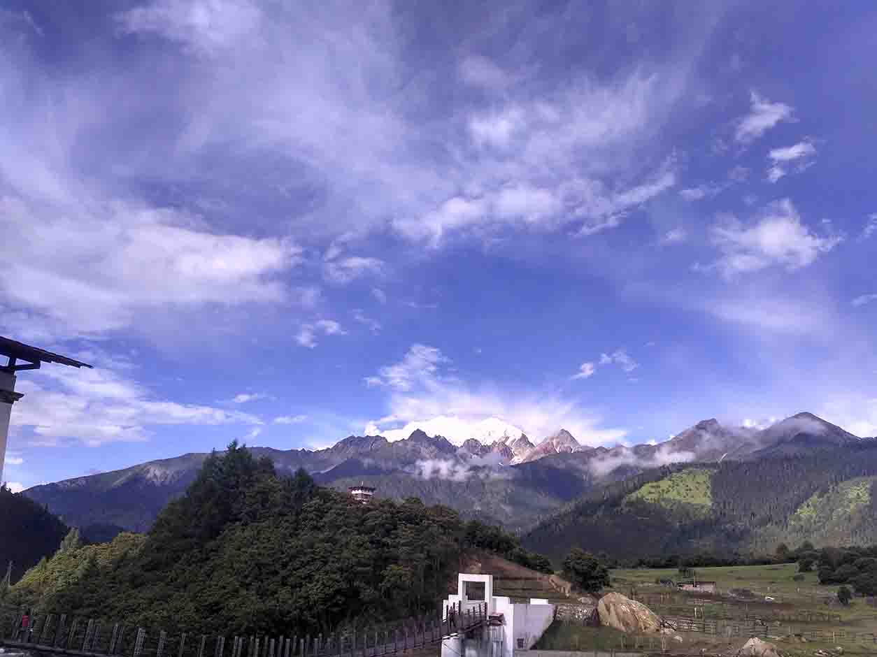 ▼刚到鲁朗的时候,天气晴朗,云彩都散了,正好看见了只露出一角的中国最美雪山–南迦巴瓦峰。